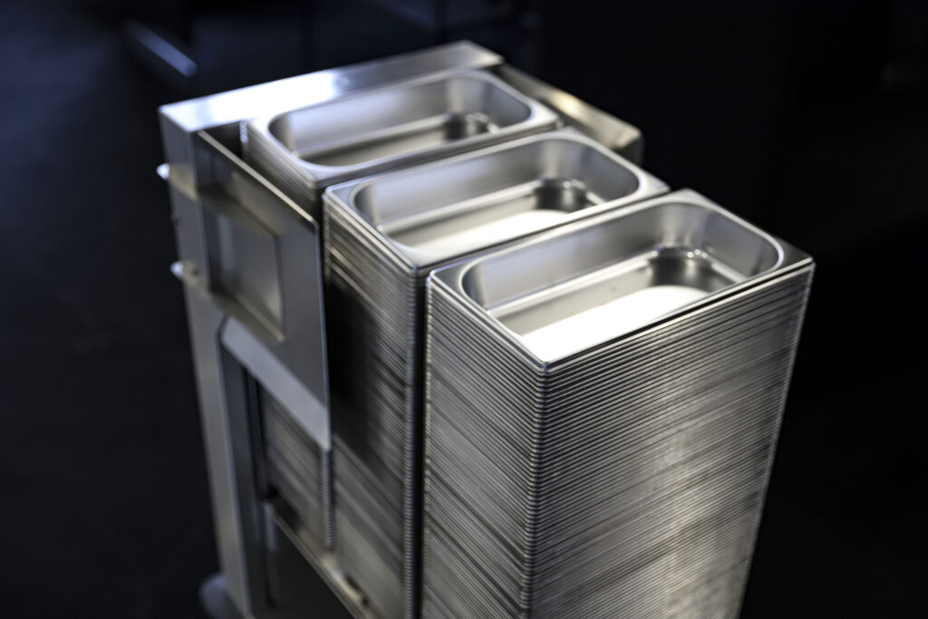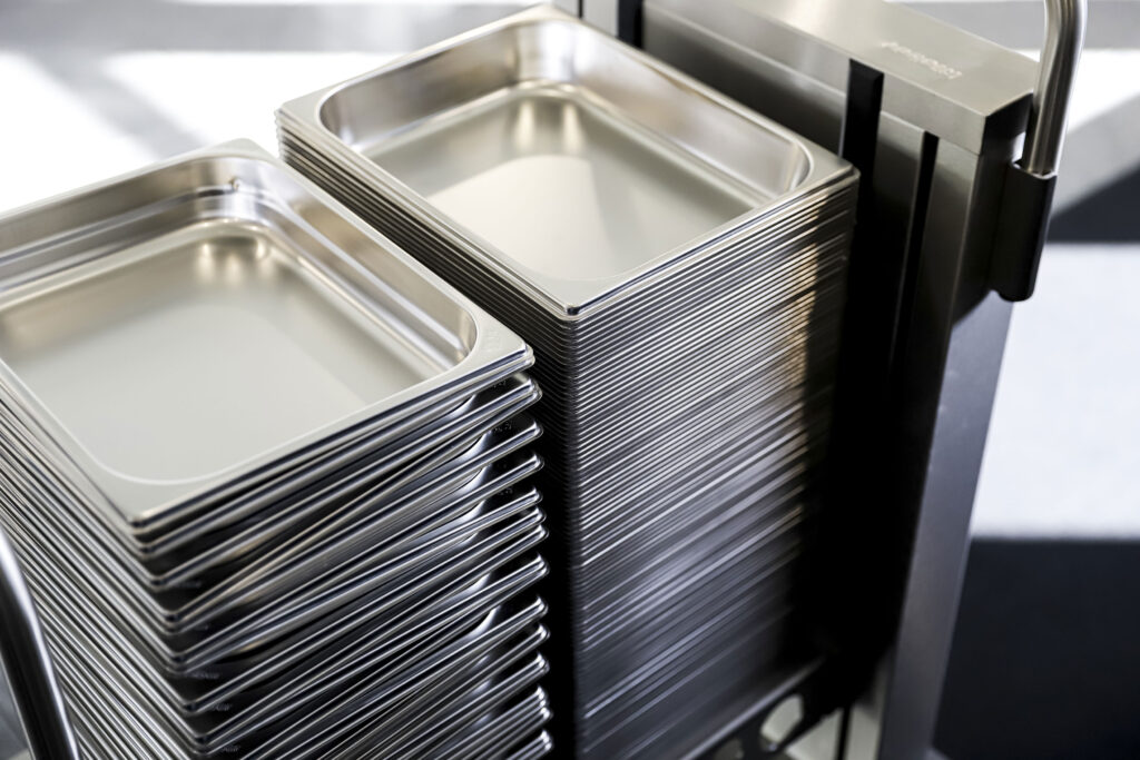 The combination of GN containers and the GNauto stacking system highlights a key advantage: the conical design of GNauto containers allows for significantly higher stacking density, while maintaining stability within the trolley compared to standard GN containers.